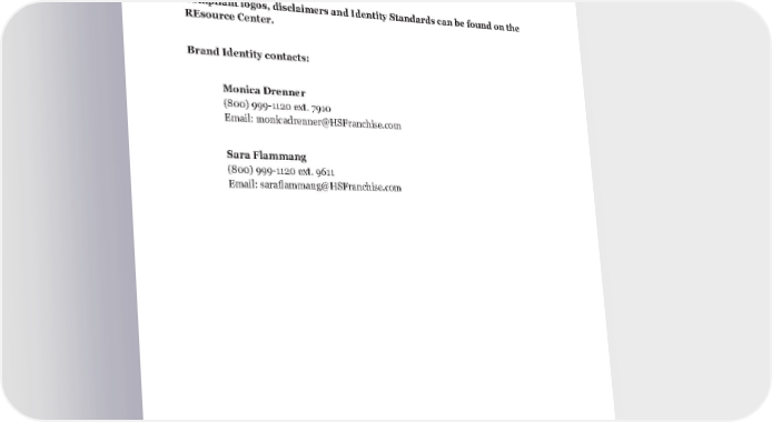 Berkshire Hathaway HomeServices Basic Branding Guidelines 38 10. Use of word “REALTORS ® .” Keeping in mind that the name “ r EAL t O r ® ” is a registered mark of the National Association of r EAL t O r S ® , that name should not be used to generically refer to real estate professionals. y our use of the r EAL t O r ® mark must comply with the specifications of the National Association of r EAL t O r S ® . Compliant logos, disclaimers and Identity Standards can be found on the REsource Center. Brand Identity contacts: Monica Drenner (800) 999-1120 ext. 7910 Email: monicadrenner@HSFranchise.com Sara Flammang (800) 999-1120 ext. 9611 Email: saraflammang@HSFranchise.com