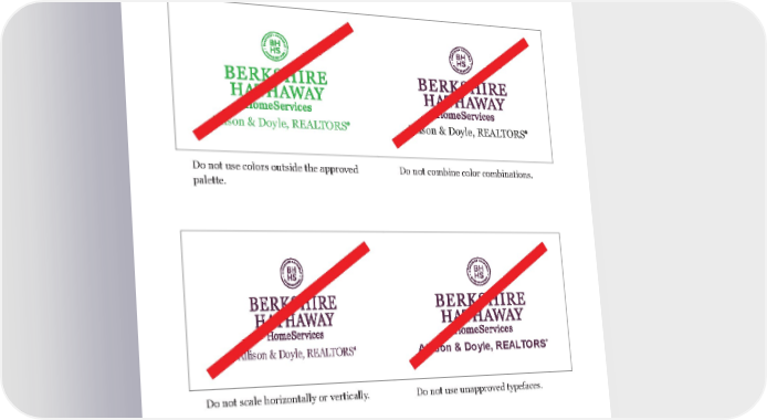 Berkshire Hathaway HomeServices Basic Logo, DBA and y ard Sign Guidelines 29 29 Allison & Doyle, REALTORS Allison & Doyle, REALTORS Allison & Doyle, REALTORS ® Allison & Doyle, REALTORS t he following examples show some of the possible misuses of the combined Berkshire Hathaway HomeServices and DBA Name logo. t o ensure correct, consistent usage, always follow the preceding rules. Do not use colors outside the approved palette. Do not scale horizontally or vertically . Do not combine color combinations. Do not use unapproved typefaces. I NCO rr EC t U S E