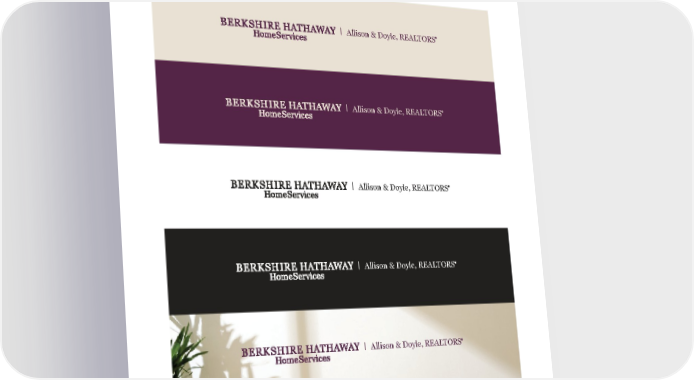 Berkshire Hathaway HomeServices Basic Branding Guidelines 28 A DDI t IONAL C OLO r O P t IONS Horizontal stack (side by side) without Quality Seal. Allison & Doyle, REALTORS Allison & Doyle, REALTORS Allison & Doyle, REALTORS Allison & Doyle, REALTORS Allison & Doyle, REALTORS Black and white color options are for marketing/advertising materials only and are not to be used for yard signs.