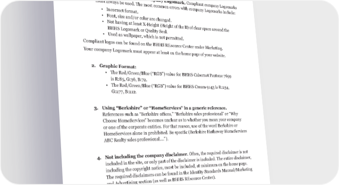 Berkshire Hathaway HomeServices Basic Branding Guidelines 36 I N t E r NE t – C OMMON Err O r S t he following are common errors we see repeatedly on affiliate and sales professional websites. Please note that these errors are often found in printed advertisements as well, so you may want to review your overall marketing and advertising components. 1. Not using your correct company Logomark. Compliant company Logomarks must always be used. t he most common errors with company Logomarks include: • Incorrect format. • Font, size and/or color are changed. • n ot having at least X -Height (Height of the B) of clear space around the BHHS Logomark or Quality Seal. • U sed as wallpaper, which is not permitted. Compliant logos can be found on the BHHS r Esource Center under Marketing. y our company Logomark must appear at least on the home page of your website. 2. Graphic Format: • The Red/Green/Blue (“R GB”) value for BHHS Cabernet P antone 7659 is r :85, G:36, B:72. • The Red/Green/Blue (“R GB”) value for BHHS Cream 9143 is R:234, G:277, B:212. 3. Using “Berkshire” or “HomeServices” in a generic reference. r eferences such as “Berkshire offices,” “Berkshire sales professional” or “ Why Choose HomeServices” becomes unclear as to whether you mean your company or one of the corporate entities. For that reason, use of the word Berkshire or HomeServices alone in prohibited. Be specific (Berkshire Hathaway HomeServices ABC r ealty sales professional....”). 4. Not including the company disclaimer. Often, the required disclaimer is not included in the site, or only part of the disclaimer is included. t he entire disclaimer, including the copyright notice, must be included, at minimum on the home page. The required disclaimers can be found in the Identity Standards Manual/Marketing and Advertising section (as well as BHHS r Esource Center). 5. Use of the Logomark or Quality Seal. Neither the Logomark nor the Quality Seal can be animated or used as wallpaper. t hey may not be incorporated into another logo or graphic.