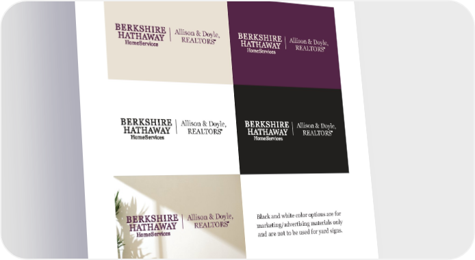 Berkshire Hathaway HomeServices Basic Branding Guidelines 26 A DDI t IONAL C OLO r O P t IONS Vertical stack (side by side) without Quality Seal. Allison & Doyle, REALTORS Allison & Doyle, REALTORS Allison & Doyle, REALTORS Allison & Doyle, REALTORS Allison & Doyle, REALTORS Black and white color options are for marketing/advertising materials only and are not to be used for yard signs.