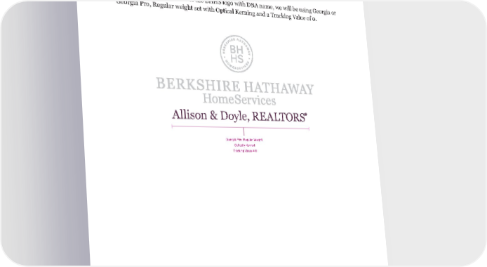 ty POG r APH y Georgia or Georgia Pro, our primary typeface, reflects the BHHS brand proposition. Its classic look speaks to trust; it is also a font designed for digital purposes. For all uses and variations of the BHHS logo with DBA name, we will be using Georgia or Georgia Pro, Regular weight set with Optical Kerning and a Tracking Value of 0. Berkshire Hathaway HomeServices Basic Logo, DBA and y ard Sign Guidelines 10 Allison & Doyle, REALTORS Georgia Pro, Regular Weight Optically Kerned Tracking Value = 0