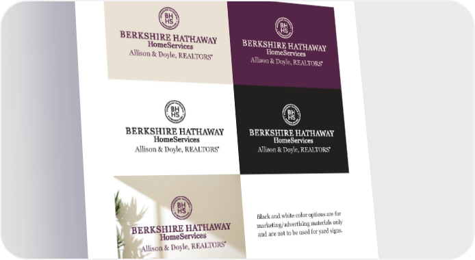 Berkshire Hathaway HomeServices Basic Logo, DBA and y ard Sign Guidelines 23 Horizontal stack with Quality Seal. A DDI t IONAL C OLO r O P t IONS Allison & Doyle, REALTORS Allison & Doyle, REALTORS Allison & Doyle, REALTORS Allison & Doyle, REALTORS Allison & Doyle, REALTORS Black and white color options are for marketing/advertising materials only and are not to be used for yard signs.