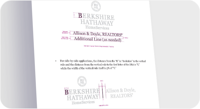 Berkshire Hathaway HomeServices Basic Branding Guidelines 12 • The size of the DBA must be no more than 85% of “X” and no less than 66% of “X.” • The DBA must be same size on both lines (as needed). • Affiliate DBAs are set in upper and lower case, with the exception of the word “ r EAL t O r S ® ” (where applicable). • For side-by-side applications, the distance from the “E” in “Berkshire” to the vertical rule and the distance from the vertical rule to the first letter of the DBA is “ y ,” while the width of the vertical rule itself is 5% of “Y .” Allison & Doyle, REALTORS Additional Line (as needed) X Between 66-85% X Same Size as First Line 50% X DBA Set in Georgia Pro Font, Regular Weight, 0 Tracking Allison & Doyle, REALTORS 5% Y Vertical Rule Line Y Y Y
