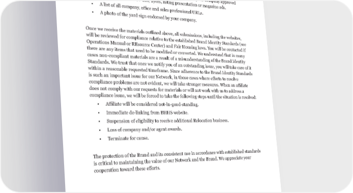 Berkshire Hathaway HomeServices Basic Branding Guidelines 3 Br AND I DEN t I ty C OMPLIANCE Every affiliate is required to submit the following during the audit process: • Sample of the business card format endorsed by your company . • Sample of marketing materials, which could include your company approved brochure, radio or t V ads, flyers, listing presentation or magazine ads. • A list of all company , office and sales professional URLs. • A photo of the yard sign endorsed by your company . Once we receive the materials outlined above, all submissions, including the websites, will be reviewed for compliance relative to the established Brand Identity Standards (see Operations Manual or r Esource Center) and F air Housing laws. y ou will be contacted if there are any items that need to be modified or converted. We understand that in many cases non-compliant materials are a result of a misunderstanding of the Brand Identity Standards. W e trust that once we notify you of an outstanding issue, you will take care of it within a reasonable requested timeframe. Since adherence to the Brand Identity Standards is such an important issue for our Network, in those cases where efforts to resolve compliance problems are not evident, we will take stronger measures. When an affiliate does not comply with our requests for materials or will not work with us to address a compliance issue, we will be forced to take the following steps until the situation is resolved: • Affiliate will be considered not-in-good-standing. • Immediate de-linking from BHHS website. • Suspension of eligibility to receive additional Relocation business. • Loss of company and/or agent awards. • T erminate for cause. t he protection of the Brand and its consistent use in accordance with established standards is critical to maintaining the value of our Network and the Brand. W e appreciate your cooperation toward these efforts.