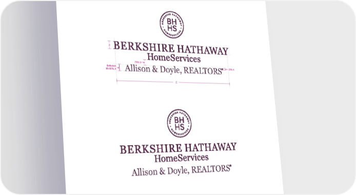 Berkshire Hathaway HomeServices Basic Logo, DBA and y ard Sign Guidelines 15 • DBA must be centered along with the Berkshire Hathaway logomark. • DBA must not extend beyond Z. H ORIZO n TAL S TACK w ITH Q UALITY S EAL Allison & Doyle, REALTORS Z X 25% X 75% X Between 66-85% X Allison & Doyle, REALTORS