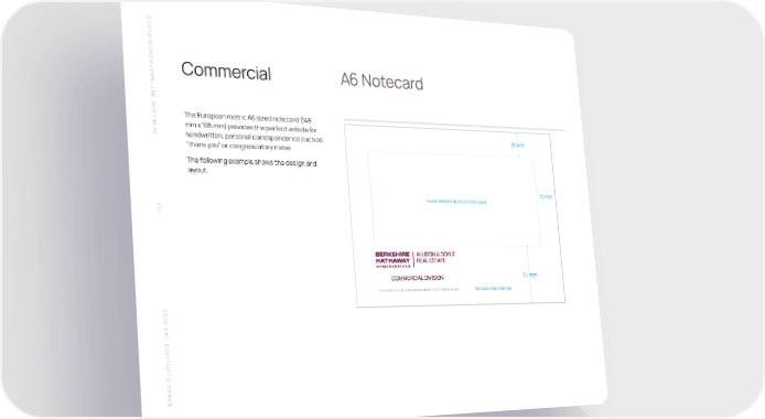 S SERVICE HOME Y A Commercial A6 Notecard W THA SHIRE HA The European metric A6 sized notecard (148 mm x 105 mm) provides the perfect vehicle for BERK handwritten, personal correspondence such as 15 mm “thank you” or congratulatory notes. The following example shows the design and layout. 15 mm Hand-Writt en Note Content Area 142 35 mm A member of the franchise system of BHH Aff iliates, LLC Text set in 6pt Manrope N 2023 A S J BRAND GUIDELINE