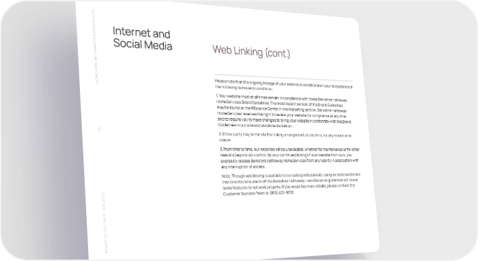 S SERVICEInternet and HOME Y A Social Media Web Linking (cont.) W THA SHIRE HA Please note that the ongoing linkage of your website is conditional on your acceptance of BERK the following terms and conditions: 1. Your website must at all times remain in compliance with these Berkshire Hathaway HomeServices Brand Guidelines. The most recent version of the Brand Guidelines may be found on the REsource Center in the Marketing section. Berkshire Hathaway HomeServices reserves the right to review your website for compliance at any time, and to require you to make changes to bring your website in conformity with the Brand Guidelines in our sole and absolute discretion. 35 2. Either party may terminate the linking arrangement at any time, for any reason or no reason. 3. From time to time, our websites will be unavailable, whether for maintenance or for other reasons beyond our control. By your continued linking of your website from ours, you expressly release Berkshire Hathaway HomeServices from any liability in association with any interruption of access. Note: Though web linking is available to our sales professionals, using an external domain that directs consumers off the Berkshire Hathaway HomeServices global site will cause some features to not work properly. If you would like more details, please contact the Customer Success Team at (855) 422-9052. N 2023 A S J BRAND GUIDELINE