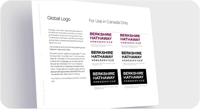 S SERVICE HOME Y A Global Logo For Use in Canada Only W THA SHIRE HA The logo is the most important expression of the Berkshire Hathaway HomeServices brand BERK and should be treated with the greatest care. The Berkshire Hathaway HomeServices logo is a proprietary artwork and original files should always be used. Cabernet logo with Trademark (to be used in Cabernet logo with Marque de Commerce (to be English-speaking Provinces) used in French-speaking Provinces) The allowed brand colors for the global logo are Cabernet, Black and White. 61 You must use the registered trademark “®” with the logo after “HomeServices” for all company material in Canada. In Provinces where French is the primary language, you should use the Marque de Commerce “MC” on all material Black logo with Trademark (to be used in English- Black logo with Marque de Commerce (to be used with the Berkshire Hathaway HomeServices speaking Provinces) in French-speaking Provinces) marks. The global and company logos should always have appropriate mark after the word “HomeServices” even when in writing. Franchisees should always use their company logo. N 2023 A S J White logo with Trademark (to be used in English- White logo with Marque de Commerce (to be used speaking Provinces) in French-speaking Provinces) BRAND GUIDELINE