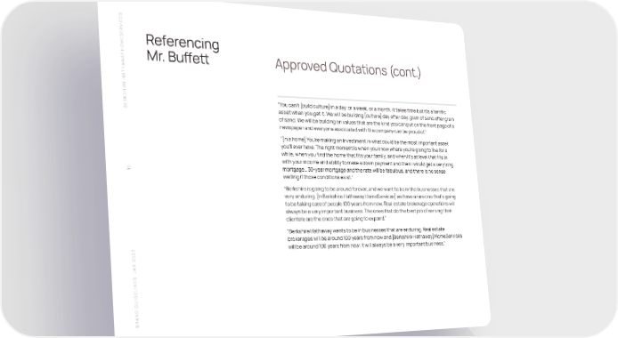 S SERVICEReferencing HOME Y A Mr. Buffett Approved Quotations (cont.) W THA SHIRE HA “You can’t [build culture] in a day, or a week, or a month, it takes time but it’s a terrific BERK asset when you get it. We will be building [culture] day after day, grain of sand after grain of sand. We will be building on values that are the kind you can put on the front page of a newspaper and everyone associated with the company can be proud of.” “[In a home] You’re making an investment in what could be the most important asset you’ll ever have. The right moment is when you know where you’re going to live for a while, when you find the home that fits your family, and when it’s at level that fits in with your income and ability to make a down payment and then I would get a very long 15 mortgage… 30-year mortgage and the rate will be fabulous, and there is no sense waiting if those conditions exist.” “Berkshire is going to be around forever, and we want to be in the businesses that are very enduring. [In Berkshire Hathaway HomeServices] we have a rare one that’s going to be taking care of people 100 years from now. Real estate brokerage operations will always be a very important business. The ones that do the best job of serving their clientele are the ones that are going to expand.” “Berkshire Hathaway wants to be in businesses that are enduring. Real estate brokerages will be around 100 years from now and [Berkshire Hathaway] HomeServices will be around 100 years from now. It will always be a very important business.” N 2023 A S J BRAND GUIDELINE