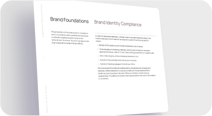 S SERVICE HOME Y A Brand Foundations Brand Identity Compliance W THA SHIRE HA The protection of the brand and its consistent use in accordance with established standards In order for Berkshire Hathaway HomeServices to maintain these standards, from BERK is critical to maintaining the value of our time to time every franchisee will be required to submit the following items for network and the brand. As such, we appreciate review: your cooperation toward these efforts. • Sample of the business card format endorsed by your company. • Three samples of marketing materials, which could include your company- approved brochure, radio or TV ads, flyers, listing presentation or magazine ads. • A list of all company, office and sales professional URLs. 6 • A photo of the yard sign endorsed by your company. • A photo of building signage in front of your office. Once we receive the materials outlined above, all submissions, including the websites, will be reviewed for compliance relative to the established Brand Guidelines (see Operations Manual or REsource Center) and Fair Housing requirements. You will be contacted if there are any items that need to be modified or converted. N 2023 A S J BRAND GUIDELINE