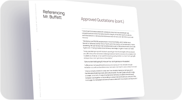 S SERVICEReferencing HOME Y A Mr. Buffett Approved Quotations (cont.) W THA SHIRE HA “I would want to be associated with somebody where the financial strength was BERK unquestioned and where the name stood for integrity. What other quality would you want that Berkshire Hathaway HomeServices does not have; and I don’t think you could find one.” “We employ over 300,000 people almost in the United States, and in market value Berkshire Hathaway is either third or fourth just in the country, so the name really means something. We love the fact that HomeServices is a part of Berkshire and we’d love to see it grow a lot. If having the Berkshire Hathaway name helps, I’m glad to have it out there.” 14 “In any operation join up with the best—you will gain from the strengths of those around you. Who else in the real estate brokerage business has the resources of a company that has [billions of] dollars of net worth? And we’re growing. So Get on a train that’s going 80 miles per hour; don’t get stuck on the sideline.” “Get on a train that’s going 80 miles per hour; don’t get stuck on the sideline.” “In [Berkshire Hathaway] HomeServices you’re dealing with the ultimate strength; HomeServices will be around tomorrow, next week, next month, and a century from now.” “What a company stands for is key over time. We talk at Berkshire Hathaway all of the time about building culture, and culture counts. You can’t [build culture] in a day, or a week, or a month, it takes time. Berkshire Hathaway and [Berkshire Hathaway] N 2023 HomeServices together will be building on values that are the kind you can put on the A S J front page of a newspaper and everyone associated with the company can be proud of.” BRAND GUIDELINE