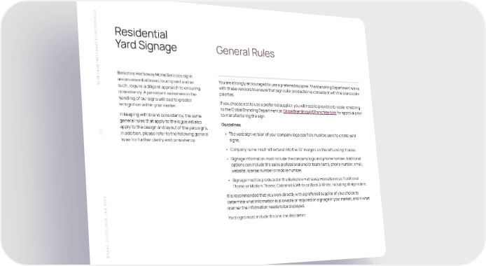 S SERVICE Residential HOME Y A Yard Signage General Rules W THA SHIRE HA Berkshire Hathaway HomeServices signs are an essential brand touch point and as You are strongly encouraged to use a preferred supplier. The Marketing Department works BERK such, require a diligent approach to ensuring with these vendors to ensure that sign color production is consistent with the brand color consistency. A persistent sameness in the palettes. handling of our signs will lead to greater If you choose not to use a preferred supplier, you will need to provide a to-scale rendering recognition within your market. to the Global Branding Department at GlobalBranding@HSFranchise.com for approval prior In keeping with brand consistency, the same to manufacturing the sign. general rules that apply to the logos will also Guidelines apply to the design and layout of the yard signs. 107 In addition, please refer to the following general • The yard sign version of your company logo eps files must be used to create yard rules for further clarity and consistency. signs. • Company name must not extend into the 1.5” margins on the left and right sides. • Signage information must include the company logo and phone number. Additional options can include the sales professional and/or team name, phone number, email, website, license number or mobile number. • Signage must be produced in the Berkshire Hathaway HomeServices Traditional Theme or Modern Theme, Cabernet & White or Black & White, including all sign riders. It is recommended that you work directly with a preferred supplier of your choice to N 2023 determine what information is allowable or required on signage in your market, and in what A manner the information needs to be displayed. S J Yard signs must include the one line disclaimer. BRAND GUIDELINE