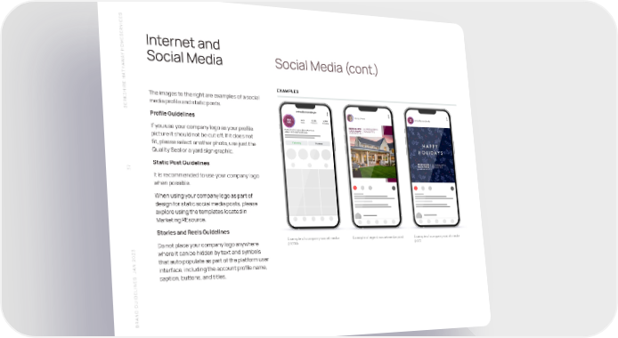 S SERVICE Internet and HOME Y A Social Media Social Media (cont.) W THA EXAMPLES SHIRE HA The images to the right are examples of a social media profile and static posts. BERK bhhsallisonanddoyle Profile Guidelines Wendy Owens BHHSAllisonandDoyle 543 6,098 5,784 Posts Followers Following If you use your company logo as your profile Berkshire Hathaway HomeServices Allison & Doyle Real Estate picture it should not be cut off. If it does not fit, please select another photo, use just the Following Message Quality Seal or a yard sign graphic. Static Post Guidelines 37 It is recommended to use your company logo when possible. When using your company logo as part of design for static social media posts, please explore using the templates located in Marketing REsource. Stories and Reels Guidelines Example of company social media Example of agent social media post Example of company social media Do not place your company logo anywhere profile post where it can be hidden by text and symbols N 2023 that auto populate as part of the platform user A interface, including the account profile name, S J caption, buttons, and titles. BRAND GUIDELINE