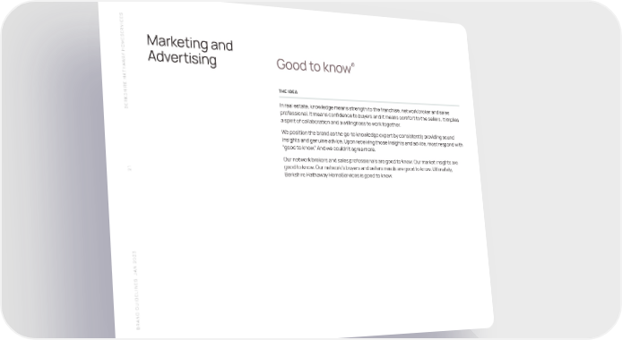 S SERVICEMarketing and HOME ® Y A Advertising Good to know W THA THE IDEA SHIRE HA In real estate, knowledge means strength to the franchise, network broker and sales BERK professional. It means confidence to buyers and it means comfort to the sellers. It implies a spirit of collaboration and a willingness to work together. We position the brand as the go-to knowledge expert by consistently providing sound insights and genuine advice. Upon receiving those insights and advice, most respond with “good to know.” And we couldn’t agree more. Our network brokers and sales professionals are good to know. Our market insights are 21 good to know. Our network’s buyers and sellers needs are good to know. Ultimately, Berkshire Hathaway HomeServices is good to know. N 2023 A S J BRAND GUIDELINE