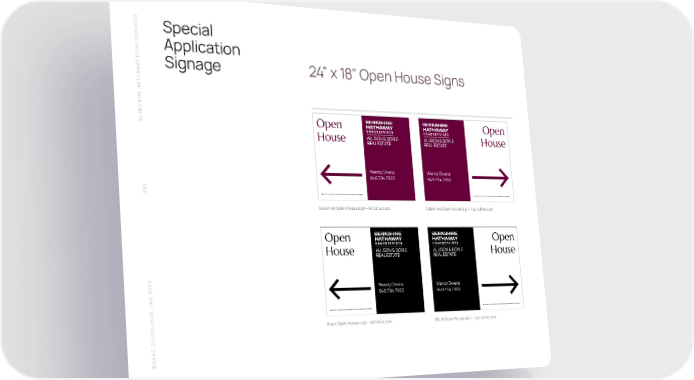 S Special SERVICE Application HOME Y A Signage 24” x 18” Open House Signs W THA SHIRE HA BERK Open Open House House Wendy Owens Wendy Owens 949 794 7900 949 794 7900 126 A member of the franchise system of BHH Affiliates, LLC Broker LIC #0987654 Agent LIC #0123456 A member of the franchise system of BHH Affiliates, LLC Broker LIC #0987654 Agent LIC #0123456 Cabernet Open House sign - left direction Cabernet Open House sign - right direction Open Open House House Wendy Owens Wendy Owens N 2023 949 794 7900 949 794 7900 A S J A member of the franchise system of BHH Affiliates, LLC Broker LIC #0987654 Agent LIC #0123456 A member of the franchise system of BHH Affiliates, LLC Broker LIC #0987654 Agent LIC #0123456 Black Open House sign - left direction Black Open House sign - right direction BRAND GUIDELINE