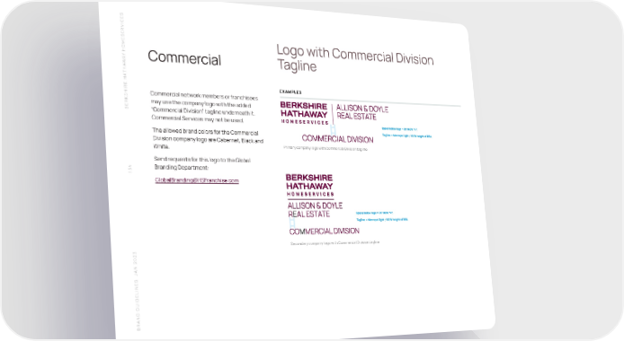S SERVICE Logo with Commercial Division HOME Y A Commercial Tagline W THA EXAMPLES SHIRE HACommercial network members or franchisees may use the company logo with the added BERK “Commercial Division” tagline underneath it. Commercial Services may not be used. The allowed brand colors for the Commercial Division company logo are Cabernet, Black and White. Primary company logo with Commercial Division tagline Send requests for this logo to the Global 134 Branding Department: GlobalBranding@HSFranchise.com Secondary company logo with Commercial Division tagline N 2023 A S J BRAND GUIDELINE
