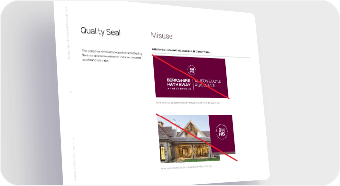 S SERVICE HOME Y A Quality Seal Misuse W THA BERKSHIRE HATHAWAY HOMESERVICES QUALITY SEAL SHIRE HAThe Berkshire Hathaway HomeServices Quality Seal is a decorative element that can be used BERK as a brand reminder. 55 Never lockup the Berkshire Hathaway HomeServices logo with the Quality Seal N 2023 A S J Never use the Quality Seal in a design layout without the logo BRAND GUIDELINE