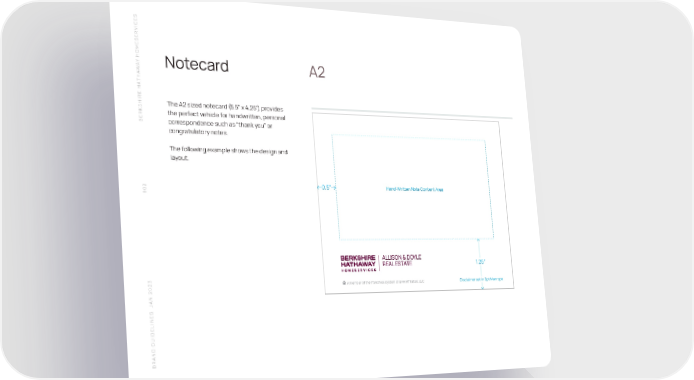 S SERVICE HOME Y A Notecard A2 W THA SHIRE HA The A2 sized notecard (5.5” x 4.25”) provides the perfect vehicle for handwritten, personal BERK correspondence such as “thank you” or congratulatory notes. The following example shows the design and layout. 0.5” Hand-Writt en Note Content Area 102 1.25” A member of the franchise system of BHH Aff iliates, LLC Disclaimer set in 6pt Manrope N 2023 A S J BRAND GUIDELINE