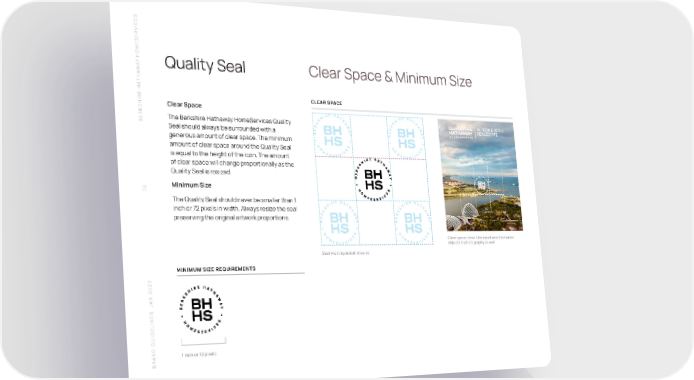 S SERVICE HOME Y A Quality Seal Clear Space & Minimum Size W THA CLEAR SPACE SHIRE HAClear Space BERK The Berkshire Hathaway HomeServices Quality Seal should always be surrounded with a generous amount of clear space. The minimum amount of clear space around the Quality Seal is equal to the height of the icon. The amount of clear space will change proportionally as the Quality Seal is resized. 52 Minimum Size The Quality Seal should never be smaller than 1 inch or 72 pixels in width. Always resize the seal preserving the original artwork proportions. Clear space should be maintained between objects in photography as well Seal width space all around MINIMUM SIZE REQUIREMENTS N 2023 A S J 1 inch or 72 pixels BRAND GUIDELINE