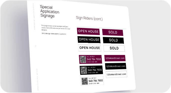 S Special SERVICEApplication HOME Y A Signage Sign Riders (cont.) W THA SHIRE HAThis page shows some examples of Open House, Sold, QR code and personal URL rider BERK designs. OPEN HOUSE SOLD QR code sign riders are 8”x (up to) 24”. OPEN HOUSE SOLD 132 OPEN HOUSE SOLD CALL OR TEXT 1234MainStreet.com 949 794 7900 ENTER CODE: 1201 CALL OR TEXT 1234MainStreet.com N 2023 949 794 7900 A ENTER CODE: 1201 S J 1234MainStreet.com CALL OR TEXT ENTER CODE: 1201 BRAND GUIDELINE