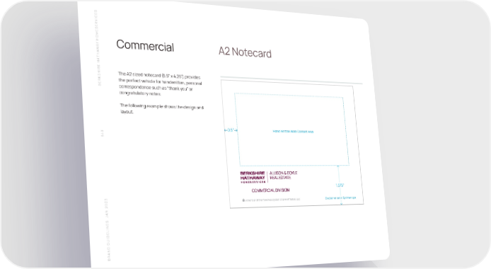 S SERVICE HOME Y A Commercial A2 Notecard W THA SHIRE HA The A2 sized notecard (5.5” x 4.25”) provides the perfect vehicle for handwritten, personal BERK correspondence such as “thank you” or congratulatory notes. The following example shows the design and layout. 0.5” Hand-Writt en Note Content Area 140 1.375” A member of the franchise system of BHH Aff iliates, LLC Disclaimer set in 6pt Manrope N 2023 A S J BRAND GUIDELINE