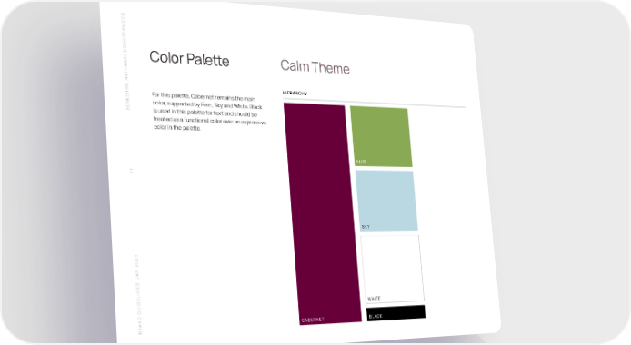 S SERVICE HOME Y A Color Palette Calm Theme W THA HIERARCHY SHIRE HAFor this palette, Cabernet remains the main color, supported by Fern, Sky and White. Black BERK is used in this palette for text and should be treated as a functional color over an expressive color in the palette. FERN 7 7 SKY N 2023 A S J WHITE CABERNET BLACK BRAND GUIDELINE