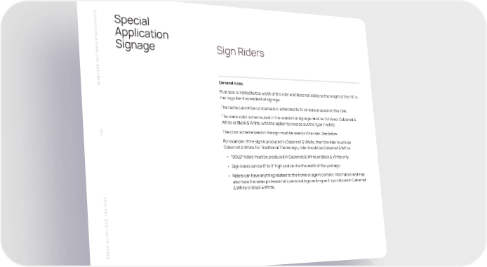 S Special SERVICEApplication HOME Y A Signage Sign Riders W THA SHIRE HA General rules BERK Font size is limited to the width of the rider and does not relate to the height of the “H” in the logo like the residential signage. The name cannot be condensed or extended to fill or reduce space on the rider. The same color scheme used in the residential signage must be followed: Cabernet & White or Black & White, with the option to reverse out the type in white. The color scheme used in the sign must be used on the rider. See below. 130 For example: if the sign is produced in Cabernet & White, then the rider must use Cabernet & White. For Traditional Theme sign, rider should be Cabernet & White. • “SOLD” riders must be produced in Cabernet & White or Black & White only. • Sign riders can be 6” to 9” high and can be the width of the yard sign. • Riders can have anything related to the home or agent contact information and may also have the sales professional’s personal logo as long as it is produced in Cabernet & White or Black & White. N 2023 A S J BRAND GUIDELINE