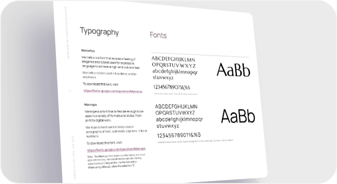 S SERVICE HOME Y A Typography Fonts W THA SHIRE HA Marcellus BERK Marcellus is a font that exudes a feeling of ABCDEFGHIJKLMN elegance and is best used for expressive OPQRSTUVWXYZ language to achieve a high-end look and feel. abcdefghijklmnopqr AaBb Marcellus is best used in headlines and for stuvwxyz emphasis. To download this font, visit: 1234567890?!&%$ 67 https://fonts.google.com/specimen/Marcellus Marcellus is best used in headlines and for emphasis Manrope ABCDEFGHIJKLMN Manrope is a font that is flexible enough to be OPQRSTUVWXYZ used in a variety of formats and styles, from print to digital work. abcdefghijklmnopqr AaBb Manrope is best used in body copy or stuvwxyz paragraphs of text, subheads, captions, links or numbers. 1234567890?!&%$ N 2023 To download this font, visit: Manrope is best used in body copy or paragraphs of text, subheads, captions, links or numbers A S J https://fonts.google.com/specimen/Manrope Note: The Manrope font does not offer italics, but most applications (e.g.: Microsoft Word) can italicize any selection by clicking on the I in the text editor. ยบ When using InDesign, skew the selection 12 . BRAND GUIDELINE