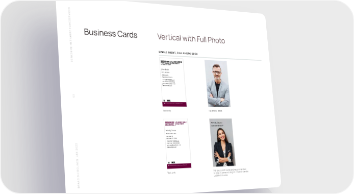S SERVICE HOME Y A Business Cards Vertical with Full Photo W THA SINGLE AGENT, FULL PHOTO BACK SHIRE HA BERK John Smith CEO / BROKER 456 Main St. Anytown, ST 12345 +1 949 794 7900 Direct +1 949 794 7900 Mobile john@allisondoyle.com allisondoyle.com 93 A member of the franchise system of BHH Aff iliates, LLC Text only Full photo - back Wendy Owens YOUR FOREVER AGENTĀ® Wendy Owens SALES ASSOCIATE 456 Main St. Anytown, ST 12345 +1 949 794 7900 Direct +1 949 794 7900 Mobile wendy@allisondoyle.com allisondoyle.com N 2023 A S J A member of the franchise system of BHH Aff iliates, LLC Text only Full photo with name and recommended tagline. A personal slogan, however can be used in this area. BRAND GUIDELINE