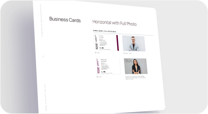 S SERVICE HOME Y A Business Cards Horizontal with Full Photo W THA SINGLE AGENT, FULL PHOTO BACK SHIRE HA John Smith BERK CEO / BROKER 456 Main St. Anytown, ST 12345 +1 949 794 7900 Direct +1 949 794 7900 Mobile john@allisondoyle.com allisondoyle.com A member of the franchise system of BHH Aff iliates, LLC Text only Full photo - back 84 Wendy Owens Wendy Owens SALES ASSOCIATE YOUR FOREVER AGENTĀ® 456 Main St. Anytown, ST 12345 +1 949 794 7900 Direct +1 949 794 7900 Mobile wendy@allisondoyle.com allisondoyle.com A member of the franchise system of BHH Aff iliates, LLC Text only Full photo with name and recommended tagline. A personal slogan, however can be used in this area. N 2023 A S J BRAND GUIDELINE
