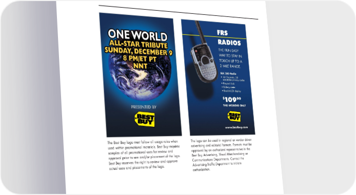 LINKING THE LOGO LINKING LOGO TO OTHER LOGOS OR ELEMENTS Partnerships or sponsorships of vendor and entertainment advertising are key elements in extending the brand equity. Adherence to the logo usage standards reinforces the consumer’s image of Best Buy. FRS RADIOS THE FUN EASY WAY TO STAY IN TOUCH UP TO A 2 MILE RANGE. SLK 280 Radio • 14 Channels, 38 selectable privacy codes • Keypad Lock • Battery meter • Backlit LCD display $ 00 109 PRESENTED BY THIS WEEKEND ONLY www.bestbuy.com The Best Buy logo must follow all usage rules when The logo can be used in regional or vendor driven used within promotional materials. Best Buy requires advertising and editorial formats. Formats must be samples of all promotional uses for review and approved by an authorized representative in the approval prior to use and/or placement of the logo. Best Buy Advertising, Visual Merchandising or Best Buy reserves the right to review and approve Communications Departments. Contact the actual uses and placements of the logo. Advertising-Traffic Department to initiate authorization. Job #: BES0003 File name: BES0003 Standards 8.5X11 Description: Corporate Identity Manual Final printed size: 8.5"X11" PAGE 10 Scale of this keyline: 100% Fonts: Futura, Helvetica Colors: 4C/2S Special Instuctions: DRILL PAGES FOR THREE RING BINDER. This page was output at 100%