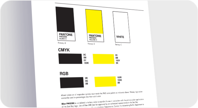 COLOR SPECIFICATIONS CORRECT APPLICATIONS Maintaining the logo color palette is essential to building the brand identity. The primary colors on this page are the only colors to be used on or in conjunction with the Best Buy logo. The use of other tertiary or background colors must be approved by an authorized representative in the Best Buy Advertising, Visual Merchandising or Communications Departments. Contact the Advertising-Traffic Department to initiate authorization. PANTONE PANTONE WHITE PROCESS PROCESS BLACK C YELLOW C Primary A Primary B Tertiary C CMYK 0C 0C 0M 0M 0Y 100Y 100K 0K RGB 0R 100R 0G 100G 0B 0B Mixed colors on all respective systems must match the PMS color palette as indicated above. Primary logo colors cannot be used in percentages less than solid color. Blue PMS288 is considered a tertiary color acceptable for use in conjuction with the primary color applications of the Best Buy logo. Use of Blue 288 must be approved by an authorized representative in the Best Buy Advertising, Visual Merchandising or Communications Departments. Contact the Advertising-Traffic Department to initiate authorization. Job #: BES0003 File name: BES0003 Standards 8.5X11 Description: Corporate Identity Manual Final printed size: 8.5"X11" PAGE 6 Scale of this keyline: 100% Fonts: Futura, Helvetica Colors: 4C/2S Special Instuctions: DRILL PAGES FOR THREE RING BINDER. This page was output at 100%