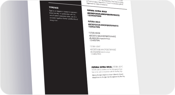 TYPESTYLEANDCOLOR APPLICATIONS CORRECT USAGE The consistent use of the Futura typeface is a key ingredient in maintaining the brand identity. Use of any other typefaces in connection with the logo must be approved by an authorized representative in the Best Buy Advertising, Visual Merchandising or Communications Departments. Contact the Advertising-Traffic Department to initiate authorization. TYPEFACE FUTURA EXTRA BOLD Type is an important element in consistent ABCDEFGHIJKLMNOPQRSTUVWXYZ brand identity. In combination with the 1234567890 use of correct corporate colors, use of a consistent typeface further solidifies brand FUTURA BOLD recognition. ABCDEFGHIJKLMNOPQRSTUVWXYZ 1234567890 FUTURA BOOK ABCDEFGHIJKLMNOPQRSTUVWXYZ abcdefghijklmnopqrstuvwxyz 1234567890 FUTURA LIGHT ABCDEFGHIJKLMNOPQRSTUVWXYZ abcdefghijklmnopqrstuvwxyz 1234567890 FUTURA EXTRA BOLD, FUTURA LIGHT, FUTURA and its variations are the only approved type face to be used in conjunction with the Best Buy logo. Mixing the type weights as shown above is allowed. Adaptations to the type must be approved by Best Buy. Job #: BES0003 File name: BES0003 Standards 8.5X11 Description: Corporate Identity Manual Final printed size: 8.5"X11" PAGE 8 Scale of this keyline: 100% Fonts: Futura, Helvetica Colors: 4C/2S Special Instuctions: DRILL PAGES FOR THREE RING BINDER. This page was output at 100%
