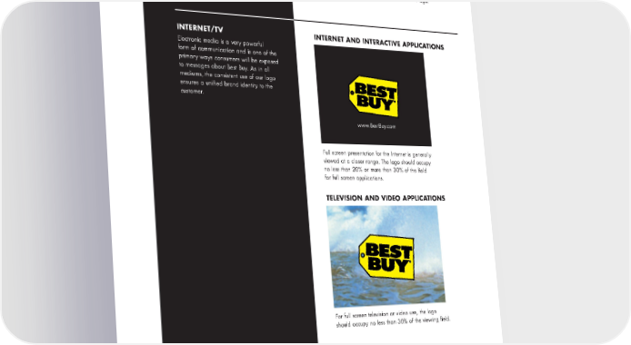 ELECTRONIC FORMAT CORRECT USAGE Best Buy reserves the right to request samples of all content or materials for review and approval prior to use and/or placement of the logo. Best Buy reserves the right to review and approve all actual uses and placements of the logo. INTERNET/TV INTERNET AND INTERACTIVE APPLICATIONS Electronic media is a very powerful form of communication and is one of the primary ways consumers will be exposed to messages about Best Buy. As in all mediums, the consistent use of our logo ensures a unified brand identity to the customer. www.BestBuy.com Full screen presentation for the Internet is generally viewed at a closer range. The logo should occupy no less than 20% or more than 30% of the field for full screen applications. TELEVISION AND VIDEO APPLICATIONS For full screen television or video use, the logo should occupy no less than 30% of the viewing field. Job #: BES0003 File name: BES0003 Standards 8.5X11 Description: Corporate Identity Manual Final printed size: 8.5"X11" PAGE 4 Scale of this keyline: 100% Fonts: Futura, Helvetica Colors: 4C/2S Special Instuctions: DRILL PAGES FOR THREE RING BINDER. This page was output at 100%