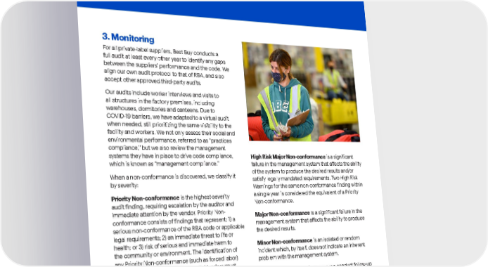 Best Buy Fiscal Year 2022 ESG Report | 63 Responsible sourcing . 3. Monitoring For all private-label suppliers, Best Buy conducts a full audit at least every other year to identify any gaps between the suppliers’ performance and the code. We align our own audit protocol to that of RBA, and also accept other approved third-party audits. Our audits include worker interviews and visits to all structures in the factory premises, including warehouses, dormitories and canteens. Due to COVID-19 barriers, we have adapted to a virtual audit when needed, still prioritizing the same visibility to the facility and workers. We not only assess their social and environmental performance, referred to as “practices compliance,” but we also review the management systems they have in place to drive code compliance, which is known as “management compliance.” When a non-conformance is discovered, we classify it by severity: Priority Non-conformance is the highest-severity audit finding, requiring escalation by the auditor and immediate attention by the vendor. Priority Non- conformance consists of findings that represent: 1) a serious non-conformance of the RBA code or applicable legal requirements; 2) an immediate threat to life or health; or 3) risk of serious and immediate harm to the community or environment. The identification of any Priority Non-conformance (such as forced labor) automatically results in a failed audit. Vendors must take immediate action to remedy all Priority Non- conformances through the Priority Non-conformance Remediation Process. If the factory is unable or unwilling to address the Priority Non-conformance, we will terminate the relationship. High Risk Major Non-conformance is a significant failure in the management system that affects the ability of the system to produce the desired results and/or satisfy legally mandated requirements. Two High Risk Warnings for the same non-conformance finding within a single year is considered the equivalent of a Priority Non-conformance. Major Non-conformance is a significant failure in the management system that affects the ability to produce the desired results. Minor Non-conformance is an isolated or random incident which, by itself, does not indicate an inherent problem with the management system. For all types of non-conformance, we conduct follow-up audits to determine if violations — whether priority, high risk major, major or minor — are resolved. All instances of non-conformance require a corrective action plan, which we approve and monitor.