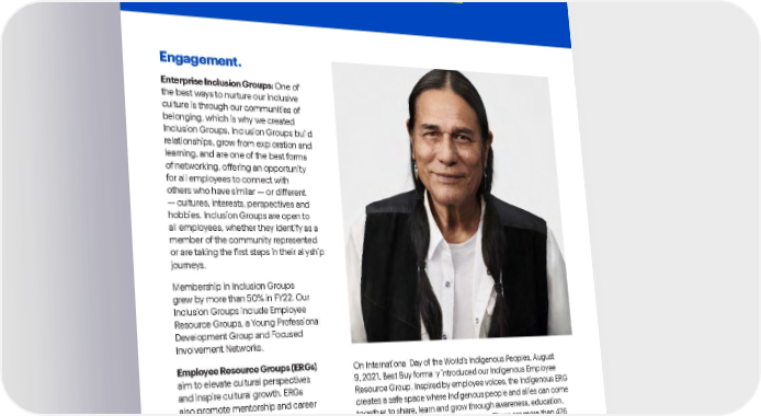 Best Buy Fiscal Year 2022 ESG Report | 46 Diversity, Equity & Inclusion . Engagement. Enterprise Inclusion Groups: One of the best ways to nurture our inclusive culture is through our communities of belonging, which is why we created Inclusion Groups. Inclusion Groups build relationships, grow from exploration and learning, and are one of the best forms of networking, offering an opportunity for all employees to connect with others who have similar — or different — cultures, interests, perspectives and hobbies. Inclusion Groups are open to all employees, whether they identify as a member of the community represented or are taking the first steps in their allyship journeys. Membership in Inclusion Groups grew by more than 50% in FY22. Our Inclusion Groups include Employee Resource Groups, a Young Professional Development Group and Focused Involvement Networks. Employee Resource Groups (ERGs) aim to elevate cultural perspectives and inspire cultural growth. ERGs also promote mentorship and career development for diverse talent. On International Day of the World’s Indigenous Peoples, August 9, 2021, Best Buy formally introduced our Indigenous Employee Resource Group. Inspired by employee voices, the Indigenous ERG creates a safe space where Indigenous people and allies can come together to share, learn and grow through awareness, education, understanding and cultural appreciation. There are more than 476 million Indigenous peoples living in 90 countries across the world. A heritage filled with a vast diversity of cultures, traditions, languages and knowledge systems, Indigenous peoples account for 6.2% of the global population — and many are part of our Best Buy family. • Asian ERG • Black ERG • disABILITIES ERG • Indigenous ERG • Unidos ERG • Military ERG • Pride ERG • Women’s ERG