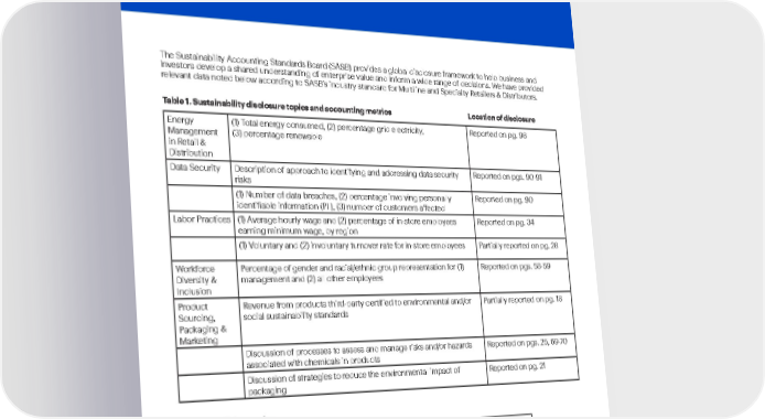 Best Buy Fiscal Year 2022 ESG Report | 99 SASB index . Energy Management in Retail & Distribution (1) Total energy consumed, (2) percentage grid electricity, (3) percentage renewable Reported on pg. 98 Data Security Description of approach to identifying and addressing data security risks Reported on pgs. 90-91 (1) Number of data breaches, (2) percentage involving personally identifiable information (PII), (3) number of customers affected Reported on pg. 90 Labor Practices (1) Average hourly wage and (2) percentage of in-store employees earning minimum wage, by region Reported on pg. 34 (1) Voluntary and (2) involuntary turnover rate for in-store employees Partially reported on pg. 28 Workforce Diversity & Inclusion Percentage of gender and racial/ethnic group representation for (1) management and (2) all other employees Reported on pgs. 58-59 Product Sourcing, Packaging & Marketing Revenue from products third-party certified to environmental and/or social sustainability standards Partially reported on pg. 18 Discussion of processes to assess and manage risks and/or hazards associated with chemicals in products Reported on pgs. 25, 69-70 Discussion of strategies to reduce the environmental impact of packaging Reported on pg. 21 Table 1. Sustainability disclosure topics and accounting metrics Location of disclosure The Sustainability Accounting Standards Board (SASB) provides a global disclosure framework to help business and investors develop a shared understanding of enterprise value and inform a wide range of decisions. We have provided relevant data noted below according to SASB’s industry standard for Multiline and Specialty Retailers & Distributors. Table 2. Activity metrics Number of: (1) retail locations and (2) distribution centers Form 10-K Total area of: (1) retail space and (2) distribution centers Form 10-K