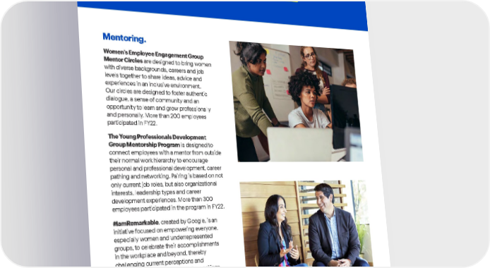 Best Buy Fiscal Year 2022 ESG Report | 45 Diversity, Equity & Inclusion . Mentoring. Women’s Employee Engagement Group Mentor Circles are designed to bring women with diverse backgrounds, careers and job levels together to share ideas, advice and experiences in an inclusive environment. Our circles are designed to foster authentic dialogue, a sense of community and an opportunity to learn and grow professionally and personally. More than 200 employees participated in FY22. The Young Professionals Development Group Mentorship Program is designed to connect employees with a mentor from outside their normal work hierarchy to encourage personal and professional development, career pathing and networking. Pairing is based on not only current job roles, but also organizational interests, leadership types and career development experiences. More than 300 employees participated in the program in FY22. #IamRemarkable , created by Google, is an initiative focused on empowering everyone, especially women and underrepresented groups, to celebrate their accomplishments in the workplace and beyond, thereby challenging current perceptions and breaking modesty norms and glass ceilings. Best Buy began piloting integration of the #IamRemarkable initiative in FY22. More than 500 participants across the enterprise have participated, and more than 17 leaders became certified facilitators and champions for the initiative, in addition to their core roles.