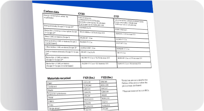 Best Buy Fiscal Year 2022 ESG Report | 98 Environmental data . Energy consumption within the organization Fuel consumption: 3,291,527,000,000,000 joules Electricity consumption: 780,913 MWh Total Scope 1 and 2: 1,696,940 MWh Fuel consumption: 3,465,161,017,412,860 joules Energy consumption: 754,846 MWh Total Scope 1 and 2: 1,717,391 MWh Energy intensity (Scope 1 + Scope 2)** .039 MWh/Sq Ft 0.0416 MWh/Sq Ft Reduction of energy consumption (Scope 1 + Scope 2)** -161,720 MWh or 9.0% decrease YOY 21,465.00 or 1.2% increase YOY Direct GHG emissions (Scope 1) 246,895 MT CO 2 e 257,049 MT CO 2 e Energy indirect GHG emissions (Scope 2 market-based) 154,284 MT CO 2 e 131,875 MT CO 2 e Other indirect GHG emisions (Scope 3)* 22,899,369 MT CO 2 e 24,181,848 MT CO 2 e GHG emissions intensity (Scope 1 + Scope 2)** .012 MT CO 2 e/Sq Ft .012 MT CO 2 e Reduction of GHG emissions (Scope 1 + Scope 2)** -82,094 MT CO 2 e or 13.0% decrease YOY -14,036 MT CO 2 e or 2.7% decrease YOY Reduction of GHG emissions (Scope 1 + Scope 2 market-based) -55,238 MT CO 2 e or 12.1 decrease YOY 12,165 MT CO 2 e or 3% decrease YOY Carbon data CY20 CY21 *Emissions are calculated for the lifetime of the product when the product was purchased. **Number does not include RECs. Materials recycled FY21 (lbs.) FY22 (lbs.) Paper 3,503,391 3,114,640 Cardboard 75,610,040 82,530,780 Plastic 1 , 9 57,0 4 0 2,667,537 Expanded polystyrene 3,888,715 5,484,640 Metal 485,224 199,991 Pallets 42,806,000 45,156,000 Totes 704,302 284,700 Single stream 16,258,000 6,492,000 Organics/compost 289,000 2 8 7, 24 0 Large equipment batteries 402,365 460,954 Other 4,446,580 212,640 Total recycling 150,350,657 146,891,122