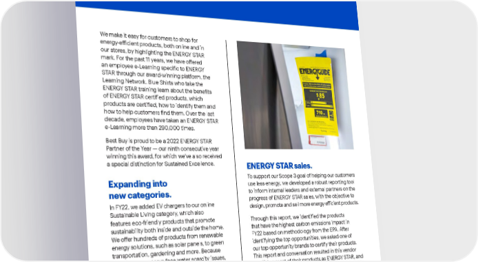 Best Buy Fiscal Year 2022 ESG Report | 19 ENERGY STAR sales. To support our Scope 3 goal of helping our customers use less energy, we developed a robust reporting tool to inform internal leaders and external partners on the progress of ENERGY STAR sales, with the objective to design, promote and sell more energy efficient products. Through this report, we identified the products that have the highest carbon emissions impact in FY22 based on methodology from the EPA. After identifying the top opportunities, we asked one of our top opportunity brands to certify their products. This report and conversation resulted in this vendor certifying most of their products as ENERGY STAR, and to design products with energy efficiency in mind. This change drastically reduced our product emissions for use of sold products. Sustainable products . We make it easy for customers to shop for energy-efficient products, both online and in our stores, by highlighting the ENERGY STAR mark. For the past 11 years, we have offered an employee e-Learning specific to ENERGY STAR through our award-winning platform, the Learning Network. Blue Shirts who take the ENERGY STAR training learn about the benefits of ENERGY STAR certified products, which products are certified, how to identify them and how to help customers find them. Over the last decade, employees have taken an ENERGY STAR e-Learning more than 290,000 times. Best Buy is proud to be a 2022 ENERGY STAR Partner of the Year — our ninth consecutive year winning this award, for which we've also received a special distinction for Sustained Excellence. Expanding into new categories. In FY22, we added EV chargers to our online Sustainable Living category, which also features eco-friendly products that promote sustainability both inside and outside the home. We offer hundreds of products from renewable energy solutions, such as solar panels, to green transportation, gardening and more. Because many areas we serve face water scarcity issues, we offer products that help customers reduce water consumption at home. These include dual-flow nozzles, water leak sensors, smart water assistants and smart irrigation systems.