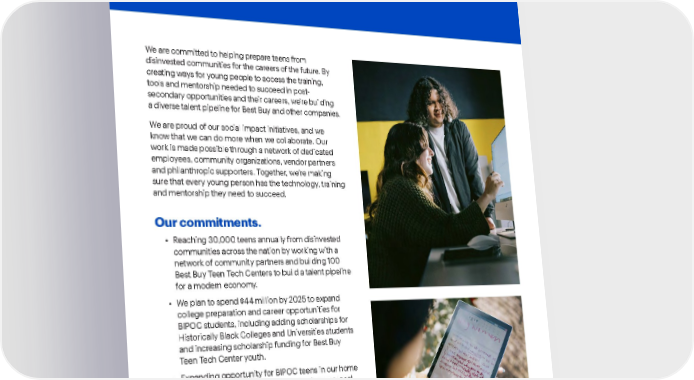 Best Buy Fiscal Year 2022 ESG Report | 74 Social impact . We are committed to helping prepare teens from disinvested communities for the careers of the future. By creating ways for young people to access the training, tools and mentorship needed to succeed in post- secondary opportunities and their careers, we’re building a diverse talent pipeline for Best Buy and other companies. We are proud of our social impact initiatives, and we know that we can do more when we collaborate. Our work is made possible through a network of dedicated employees, community organizations, vendor partners and philanthropic supporters. Together, we’re making sure that every young person has the technology, training and mentorship they need to succeed. Our commitments. • Reaching 30,000 teens annually from disinvested communities across the nation by working with a network of community partners and building 100 Best Buy Teen Tech Centers to build a talent pipeline for a modern economy. • We plan to spend $44 million by 2025 to expand college preparation and career opportunities for BIPOC students, including adding scholarships for Historically Black Colleges and Universities students and increasing scholarship funding for Best Buy Teen Tech Center youth. • Expanding opportunity for BIPOC teens in our home market of the Twin Cities by investing in more local Teen Tech Centers, creating a scholarship fund specifically for Twin Cities-based teens, committing to hosting interns from Teen Tech Centers and other program partners, and offering jobs across the company to teens.