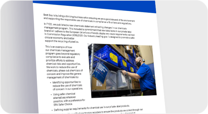 Best Buy Fiscal Year 2022 ESG Report | 25 Best Buy is building a thriving business while ensuring we are a good steward of the environment and supporting the responsible use of chemicals in compliance with all laws and regulations. In FY22, we published a new chemicals statement reflecting changes in our chemicals management program. This included a commitment that new televisions in our private label brand will adhere to the European Union’s eco-friendly display enclosure requirements outlined in Commission Regulation 2019/2021. Our industry-leading goal is designed to promote a safer circular economy and better support the recycling of plastics. This is an example of how our chemicals management program goes beyond regulatory compliance to evaluate and prioritize efforts to address chemical risks and opportunities. We work to reduce the use of chemicals, phase out chemicals of concern and improve the general management of chemicals by: • Identifying opportunities to reduce the use of chemicals of concern in our operations. • Using safer chemical alternatives wherever possible, with a preference for EPA Safer Choice. • Defining supplier requirements for chemical use in our private label products. • Partnering with qualified electronics recyclers to ensure the products we collect through our consumer recycling program are effectively re-used, recycled or safely disposed of. Collaboration among stakeholders is critical to improving the complex issue of managing chemicals in the electronics industry. We continue to participate in chemical management work groups with organizations such as the Responsible Business Alliance and the Green Chemistry and Commerce Council. Chemicals management .