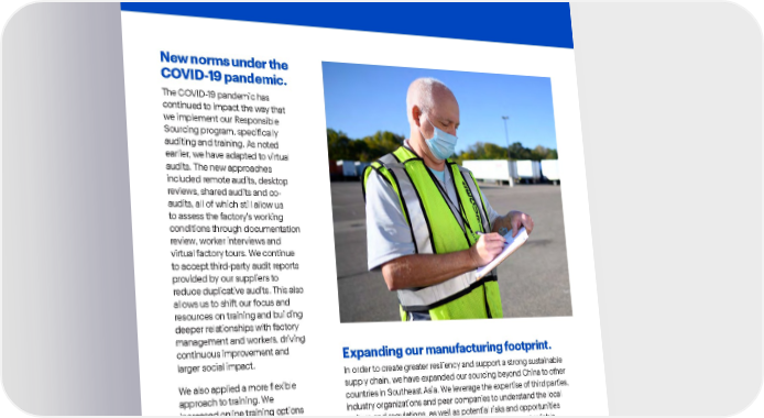 Best Buy Fiscal Year 2022 ESG Report | 66 New norms under the COVID-19 pandemic. The COVID-19 pandemic has continued to impact the way that we implement our Responsible Sourcing program, specifically auditing and training. As noted earlier, we have adapted to virtual audits. The new approaches included remote audits, desktop reviews, shared audits and co- audits, all of which still allow us to assess the factory’s working conditions through documentation review, worker interviews and virtual factory tours. We continue to accept third-party audit reports provided by our suppliers to reduce duplicative audits. This also allows us to shift our focus and resources on training and building deeper relationships with factory management and workers, driving continuous improvement and larger social impact. We also applied a more flexible approach to training. We increased online training options and provided virtual supplier workshops on our requirements and guidance for factories. These new approaches will be kept as an alternative moving forward. Responsible sourcing . Expanding our manufacturing footprint. In order to create greater resiliency and support a strong sustainable supply chain, we have expanded our sourcing beyond China to other countries in Southeast Asia. We leverage the expertise of third parties, industry organizations and peer companies to understand the local culture and regulations, as well as potential risks and opportunities associated with these areas. In order to identify the most reliable suppliers, we continue to proactively engage potential partners, conduct pre-screenings and trainings focused on high-risk issues, and participate in best practice sharing based on local laws and common findings.