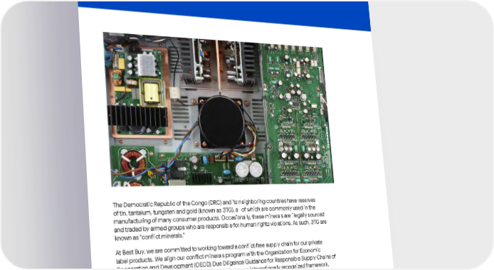 Best Buy Fiscal Year 2022 ESG Report | 72 Conflict minerals . The Democratic Republic of the Congo (DRC) and its neighboring countries have reserves of tin, tantalum, tungsten and gold (known as 3TG), all of which are commonly used in the manufacturing of many consumer products. Occasionally, these minerals are illegally sourced and traded by armed groups who are responsible for human rights violations. As such, 3TG are known as “conflict minerals.” At Best Buy, we are committed to working toward a conflict-free supply chain for our private label products. We align our conflict minerals program with the Organization for Economic Cooperation and Development (OECD) Due Diligence Guidance for Responsible Supply Chains of Minerals from Conflict-Affected and High-Risk Areas, an internationally recognized framework. Despite advances in supply chain transparency and traceability capabilities, it remains a challenge to identify, with certainty, the smelters, refiners and recyclers in our private label supply chain. Training our direct suppliers and auditing their performance are keys to addressing this. In FY22, 100 percent of our suppliers received training specific to conflict minerals, and since 2017, we’ve audited the due diligence efforts of 47 of our suppliers who use 3TG.