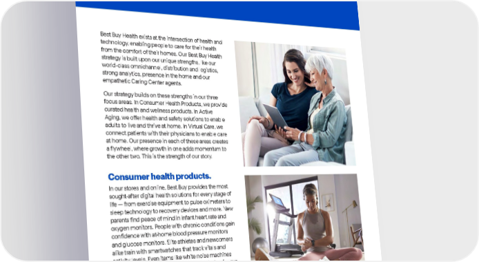 Best Buy Fiscal Year 2022 ESG Report | 36 Best Buy Health . Best Buy Health exists at the intersection of health and technology, enabling people to care for their health from the comfort of their homes. Our Best Buy Health strategy is built upon our unique strengths, like our world-class omnichannel, distribution and logistics, strong analytics, presence in the home and our empathetic Caring Center agents. Our strategy builds on these strengths in our three focus areas. In Consumer Health Products, we provide curated health and wellness products. In Active Aging, we offer health and safety solutions to enable adults to live and thrive at home. In Virtual Care, we connect patients with their physicians to enable care at home. Our presence in each of these areas creates a flywheel, where growth in one adds momentum to the other two. This is the strength of our story. Consumer health products. In our stores and online, Best Buy provides the most sought-after digital health solutions for every stage of life — from exercise equipment to pulse oximeters to sleep technology to recovery devices and more. New parents find peace of mind in infant heart rate and oxygen monitors. People with chronic conditions gain confidence with at-home blood pressure monitors and glucose monitors. Elite athletes and newcomers alike train with smartwatches that track vitals and activity levels. Even items like white noise machines and weighted blankets make life more relaxing for our customers. Many pandemic consumer trends support the future of this health and wellness space — as people seek ways to manage stress, maintain a healthy lifestyle, improve sleep and navigate chronic conditions.