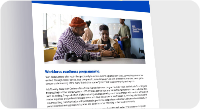 Best Buy Fiscal Year 2022 ESG Report | 76 Best Buy Teen Tech Centers . Workforce readiness programming. Teen Tech Centers offer youth the opportunity to explore technology and learn about careers they never knew existed. Through career panels, local company tours and engagement with professional mentors, teens gain a deeper understanding of the many “behind the scenes” jobs in their local community and beyond. Additionally, Teen Tech Centers offer a formal Career Pathways program to older youth that helps build a bridge to the post-high school world. Cohorts of 10-15 teens gather regularly for six to nine months to learn technical skills such as coding, film production, digital marketing, and app development. Teens engage with mentors with subject matter expertise and professional experience, and develop workforce readiness skills, including interviewing and resume writing, communication with peers and supervisors, and professional dress. Each teen who successfully completes the training program is placed into a paid summer internship in their local community. The Best Buy Foundation provides Teen Tech Centers an annual grant to staff and run the program, along with funding to a slate of national partner organizations to lead technical skills training. Past national partners have included organizations such as Creating IT Futures, Cyber Seniors, Fresh Films, and Grammy Museum. We are expanding our Career Pathways offerings over the upcoming fiscal year to include opportunities such as a paid Direct-to-Hire program to prepare Teen Tech Center youth for a range of career opportunities at Best Buy and other companies.