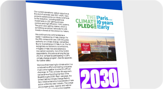 Best Buy Fiscal Year 2022 ESG Report | 12 Sustainable operations . Our current operational carbon reduction at the end of calendar year 2021 is 62% . Many projects scaled across our stores contribute to the reduction, including additional investments in LED lighting, process controls and high efficiency HVAC systems. The grid is also getting cleaner, which is something we actively advocate for with investor-owned utilities and policy makers. We continue to be commended as a leader in addressing climate change. For the fifth consecutive year, CDP, the global authority on climate change, named Best Buy to its prestigious Climate A List. The list recognizes our actions to cut emissions, mitigate climate risks and advance a low-carbon economy. Out of the 13,000 respondents, this puts us among the top 2% of all companies participating in CDP’s climate change program. (See the appendix for further data.) We know that meaningful climate action is a collaborative effort and leading companies must come together to solve this difficult challenge. In FY22, to foster this approach, we became a founding member of the Breakthroughs 2030: Retail campaign, the United Nations Climate Change Race to Zero initiative that aims to accelerate climate action within the retail industry. The pledge encourages global, regional and national retailers to take climate action together through the setting of science-based targets and committing to achieve net-zero carbon emissions by 2050.