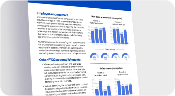 Best Buy Fiscal Year 2022 ESG Report | 16 Diversion rate 69% FY20 65% FY19 72% FY22 Waste reduction . Employee engagement. Employee engagement is a key component of our waste- reduction strategy. In FY22, corporate teams partnered with field employees to develop a waste-minimization and recycling assessment tool to maximize the materials recycled at our locations. We also created three new e-learnings that support our waste-minimization efforts that focus on how to properly recycle materials using equipment in supply chain locations. Our employees are demonstrating their commitment to the environment by organizing “green teams” in several supply chain locations. Members are supporting the waste-diversion strategy by educating colleagues and innovating around further environmental improvements. Other FY22 accomplishments: • We are partnering upstream with appliance vendors to be part of the solution to minimize waste in our distribution centers. As an example, we encouraged a vendor to transition from using adhesives such as glue to using removable tape, allowing in-bound shipping containers and product packaging to be fully recycled. • We are optimizing the number of trips for our trash haulers by using automated compactor monitors. Hauls are scheduled only when compactors are full, lowering our carbon footprint and creating efficiency. We updated our FY21 waste diversion rate and pounds of material recycled to align with methodology that uses the EPA’s standardized weight for pallets and due to more precise data provided by our suppliers. In its disposal of hazardous materials, Best Buy utilizes authorized methods, including recycling, incineration, and use of authorized landfills. Best Buy’s service providers determine which disposal method to use by referring to hazardous waste management methods conversion tables. The conversion tables outline approved disposal methods by specific hazardous waste code. (See appendix for waste and recycling by category.) 73% FY21 Non-hazardous waste (enterprise) 90 30 120 60 150 FY21 FY20 FY19 Pounds of materials recycled FY22 148M 139M 115M 133M Pounds of materials landfilled 45 15 60 30 75 FY21 FY20 FY19 FY22 42M 62M 61M 59M 176k 47k Other waste (enterprise) Pounds of hazardous waste Pounds of universal waste 60 20 80 40 100 FY21 FY20 FY19 FY22 120 40 160 80 200 FY21 FY20 FY19 FY22 95k 32k 59k 113k 113k 125k