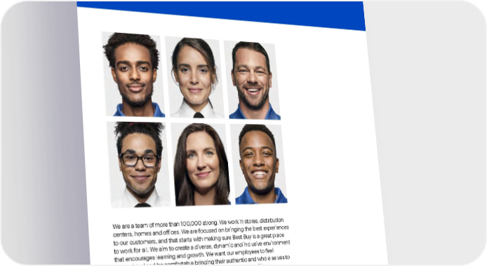 Best Buy Fiscal Year 2022 ESG Report | 27 A great place to work . We are a team of more than 100,000 strong. We work in stores, distribution centers, homes and offices. We are focused on bringing the best experiences to our customers, and that starts with making sure Best Buy is a great place to work for all. We aim to create a diverse, dynamic and inclusive environment that encourages learning and growth. We want our employees to feel appreciated and be comfortable bringing their authentic and whole selves to work. We support each other, our identities, and our communities. We are Best Buy. At the end of FY22, we employed approximately 105,000 employees in the U.S. and Canada, composed of approximately 55% full-time employees, 35% part-time employees and 10% seasonal/occasional employees.
